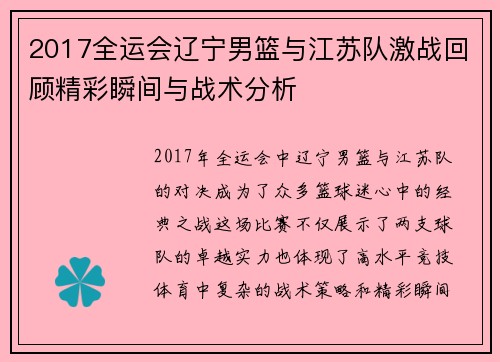 2017年全运会中,辽宁男篮与江苏队的对决成为了众多篮球迷心中的经典之战。这场比赛不仅展示了两支球队的卓越实力,也体现了高水平竞技体育中复杂的战术策略和精彩瞬间。本文将从四个方面回顾这场激烈比赛的亮点:比赛背景与重要性、精彩瞬间分析、战术运用及其影响、以及球员表现及其关键作用。通过这些方面的详细探讨,我们能够更全面地理解这场比赛对于中国篮球发展的意义,以及未来可能带来的启示。